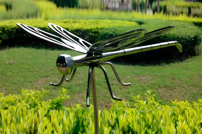 花园草丛中的抽象蜻蜓雕塑,以其独特的设计和不锈钢的材质,成为花园中的一处艺术焦点。以其创意和美感,为花园带来了一份独特的艺术氛围。